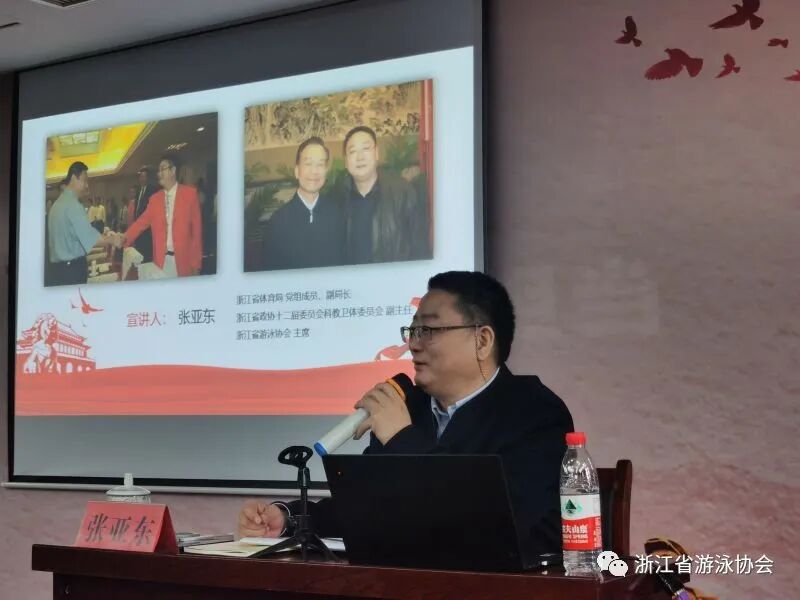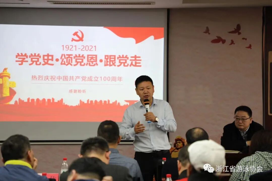 隨后,全體黨員來(lái)到紅色文化教育基地,大家席坐一堂。浙江省體育局黨組成員、副局長(zhǎng)、浙江省游泳協(xié)會(huì)主席張亞?wèn)|,結(jié)合中國(guó)共產(chǎn)黨的百年歷史,圍繞中國(guó)體育事業(yè)發(fā)展的輝煌歷程,分別從百年輝煌歷程,踐行初心使命;黨和國(guó)家領(lǐng)導(dǎo)人對(duì)體育工作的講話;以為人民服務(wù)為宗旨,積極參與公益活動(dòng);舉辦百年百賽活動(dòng),為黨獻(xiàn)禮等四個(gè)方面為全體人員上了一堂生動(dòng)的黨課。他表示:“傳承紅色基因,秉持公益理念,今年省泳協(xié)將堅(jiān)持扎根公益事業(yè),做好防溺水工作,讓更多留守兒童學(xué)會(huì)游泳,愛(ài)上體育。”