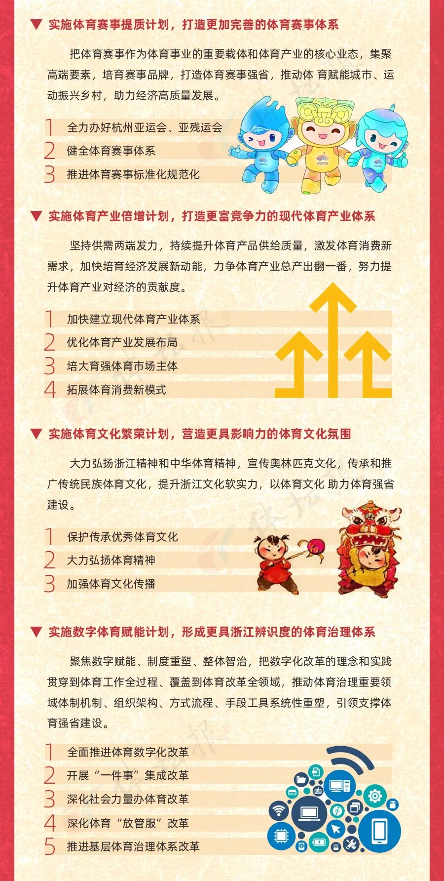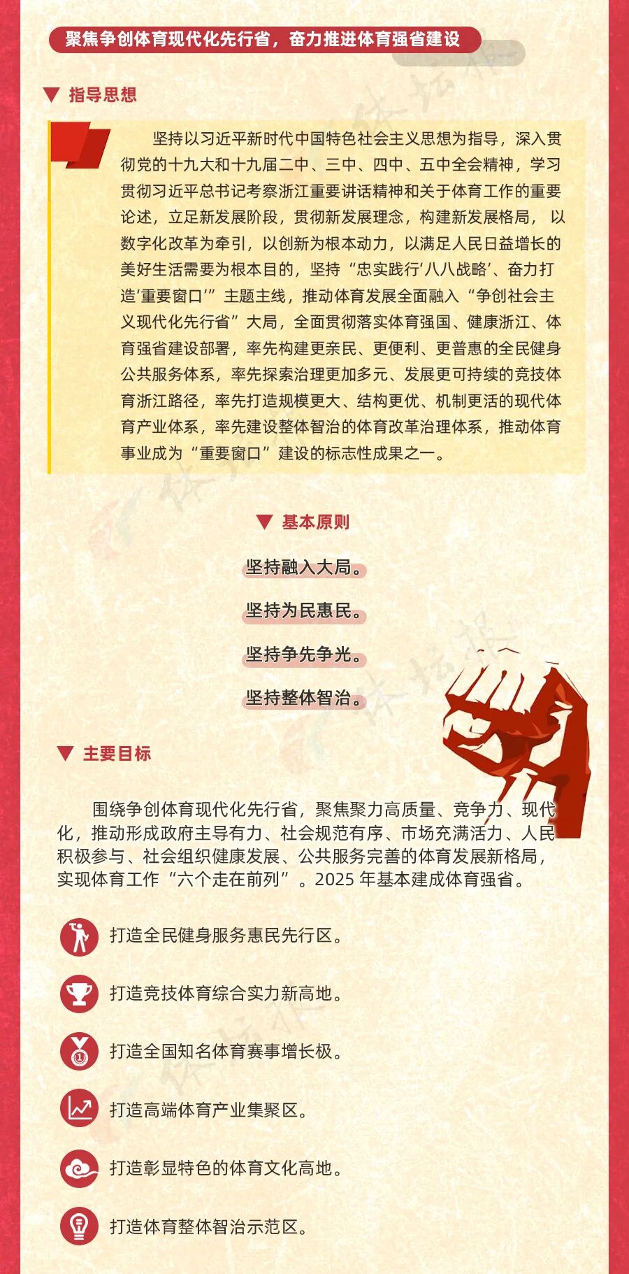 《規劃》提出,“十四五”時期,浙江要實現群眾體育、競技體育、體育賽事、體育產業、體育文化以及體育整體智治工作等“六個走在前列”。
